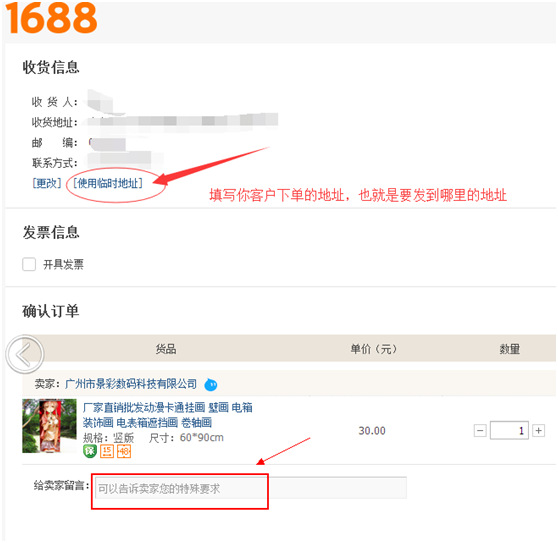 第四步:点击代代销下单后,在弹出界面选择使用临时地址,填上您客户下单的地址,也就是要发到哪里的地址,后提交订单即可。(如下图)