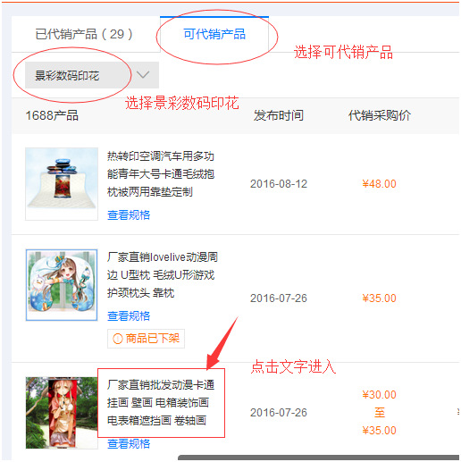 第二步:选择可代销产品,选择景彩数码印花,选择产品种类,点击文字进入(如下图)